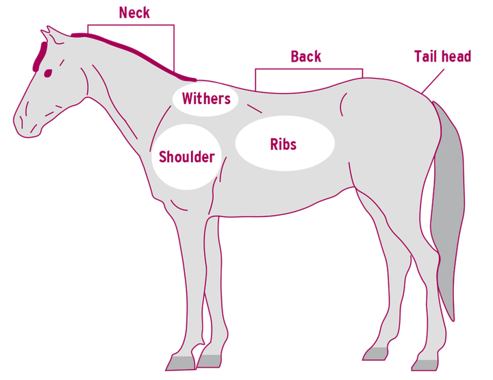 Al determinar la puntuación de condición corporal (BCS), analizamos seis áreas diferentes: el cuello, la cruz, el dorso, la base de la cola, las costillas y el área justo detrás del hombro.