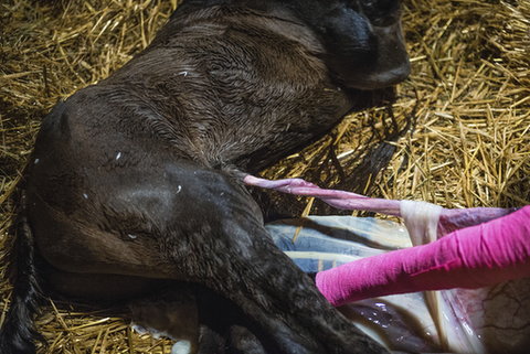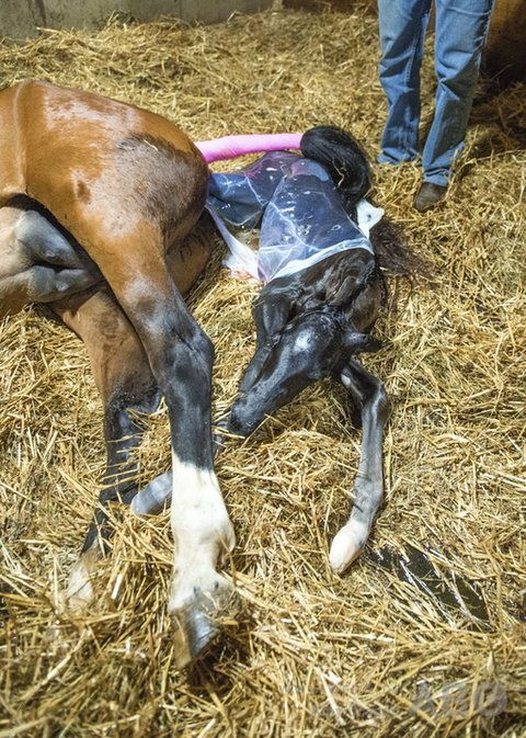 When you see that the foaling process has started, then leave your mare to it as much as possible. Foaling usually happens quite quickly. A mare usually starts sweating first, then her waters break and she will lie down. But this is not set in stone. The main thing is that there is something happening all the time, that there is progress. If your mare has been lying down for ten minutes without anything happening, it will be wise to go and have a look. If it is your first foaling experience, we recommend that you get an experienced person to attend the foaling process, such as a breeder colleague or your veterinarian.