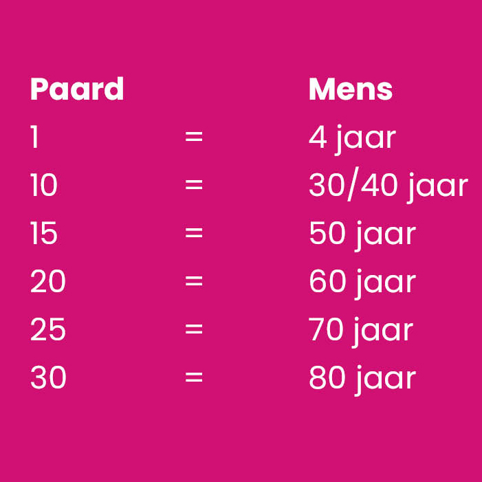 Weet jij eigenlijk hoe oud je paard is als je het vergelijk met mensenjaren? Je hoort vaak het aantal mensenjaren x 4, als je paard jong is gaat dat zeker op. Maar als je paard ouder is liggen de verhoudingen net iets anders. Kijk in de tabel hoe oud jouw paard is in mensenjaren.